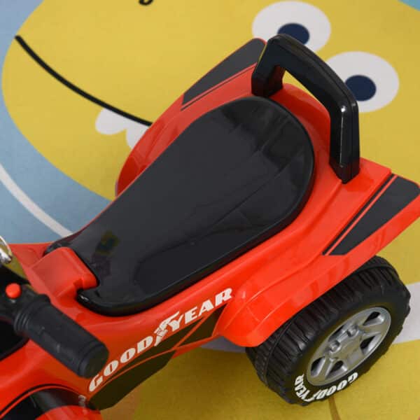 Esta Moto4 Sem Pedais Vermelho infantil, com armazenamento e licença da GOODYEAR, é ideal para crianças acima de 1 ano. Seu design permite que as crianças conduzam com facilidade, graças ao guidão e ao fato de poderem movê-lo com muita facilidade. Eles apenas têm que se sentar sobre ele e, como está baixo, para que seus pés cheguem ao chão, a cada passo que eles dão, eles podem mover o quadrilátero. Também é muito divertido, graças aos seus sons e buzina. Para tornar confortável o uso de um adulto, este quadrilátero infantil sem pedais licenciado pela GOODYEAR com armazenamento possui uma alça na parte traseira. E não vamos esquecer que, embaixo do seu assento, há um compartimento secreto para guardar lanches, brinquedos ou o que você quiser.